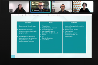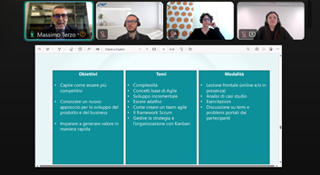 Il momento centrale del webinar è stato costituito dalla "lezione pilota" tenuta dal dottor Massimo Terzo, docente del Master Techné ed esperto Agile. Il dottor Terzo, con la sua esperienza in settori come la logistica e l'automotive, ha fornito una prospettiva pratica incentrata sulla risoluzione di problematiche reali. Sono stati trattati due temi principali, considerati fondamentali per l'Industria 4.0: