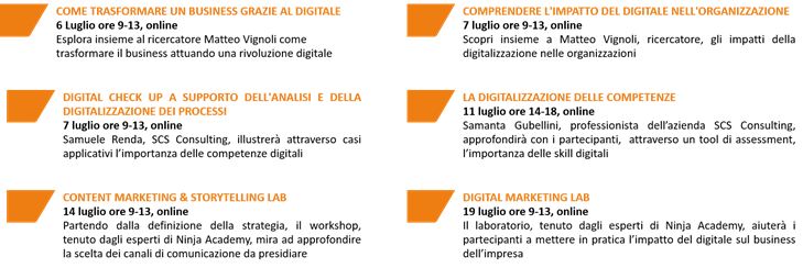 I workshop previsti per Luglio 2022 prevedono un approccio laboratoriale per approfondire la trasformazione digitale come un ridisegno dei processi e delle competenze e per comprendere l’impatto del digitale nelle organizzazioni.